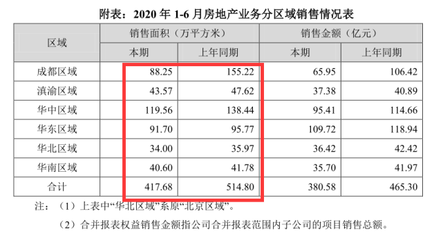 腾讯房产发现,今年上半年蓝光发展成都、滇渝、华中、华东、华北、华南六大区域不论是销售面积还是销售金额皆同比下跌,其中成都大本营在销售面积上同比下跌43.15%,销售金额也同比下跌38.03%,可谓上演“滑铁卢”式失守。