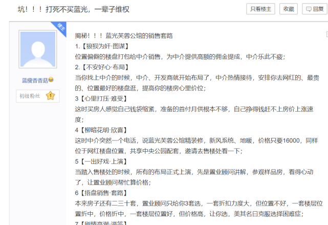 今年4月,据相关媒体报道,蓝光公园华府二期存在主管道漏水、涉嫌虚假宣传学校、不合理补差价等问题,此前因为房屋漏水、强行补差价,蓝光又陷进入陕第三年交房大坑的维权丑闻。此外,亦有网友在网上爆料了蓝光芙蓉公馆虚假销售的套路。