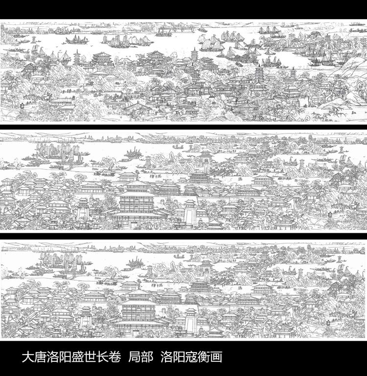 记者:什么样的机会让您要创作《大唐洛阳盛景图》? 寇衡:2010年初,国家文物局确定大运河河南段6个文物遗产项目进入大运河申遗“立即列入项目”,洛阳的含嘉仓遗址和回洛仓遗址名列其中。同时,隋唐洛阳城遗址内的通济渠也被定为“后续列入项目”。看到这个消息,我突生灵感:洛阳曾为隋朝的东京、唐朝的神都,又是隋唐大运河的中心,如果能在大运河申报世界文化遗产之际,用一幅长卷全面展示隋唐时期运河两岸洛阳的帝都盛景和市井风情,应该可以展现洛阳最繁华的景象。整理好素材后,我就和女儿寇莹开始了线描图的创作。
