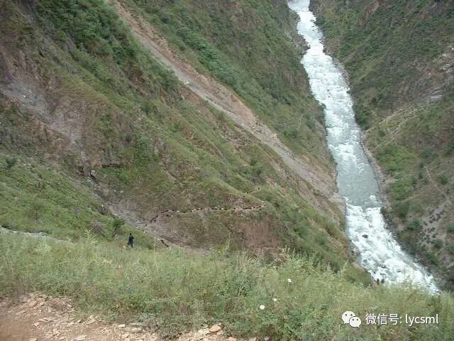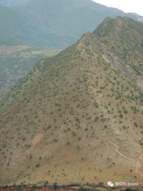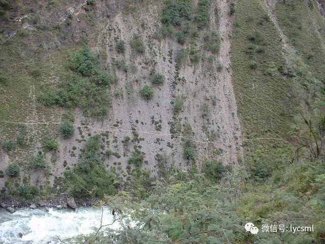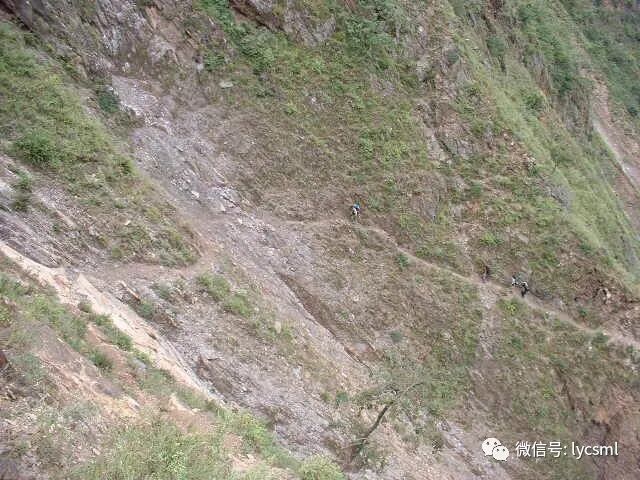 顺小路一直向上攀登,有的路段已被山体滑坡所破坏,下图中的路段还不停地有落石,队员们互相提醒着,小心地迈着步子还要注意上方冷不盯落下的石头,一不留神很可能被击中或滑下山谷。