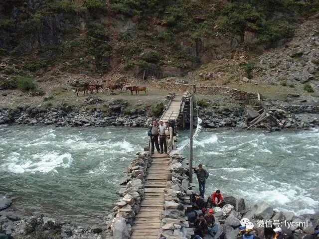 晚餐,我们用的就是经过澄清的这浑浑河水,这张照片拍摄于次日出发时,浑浑的是奔流的河水,横着的是我们的营地吊桥,左边是我们走下的大山,右边是明天将登的大山。