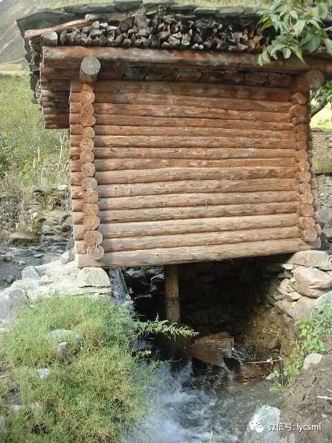 这是村头的小河边用圆木搭建的水磨房