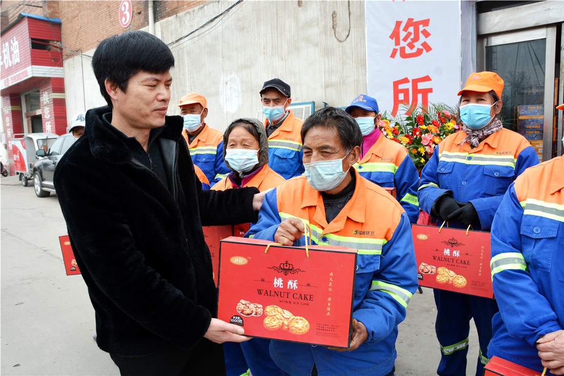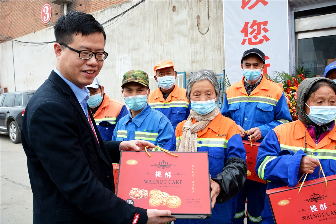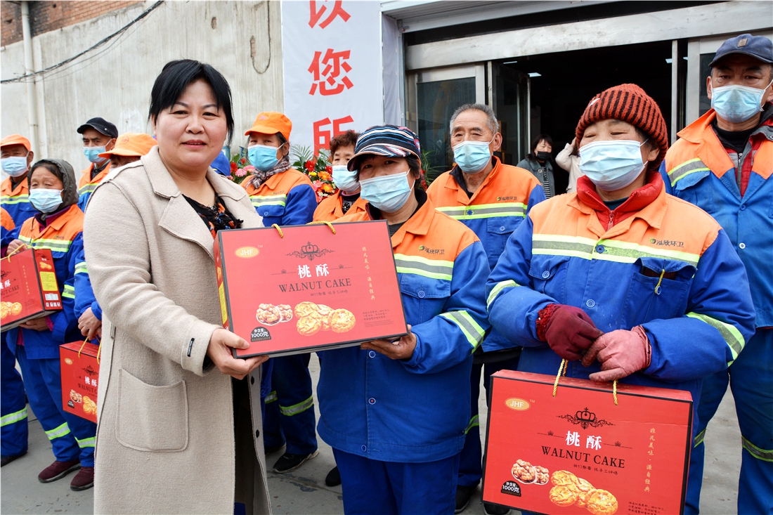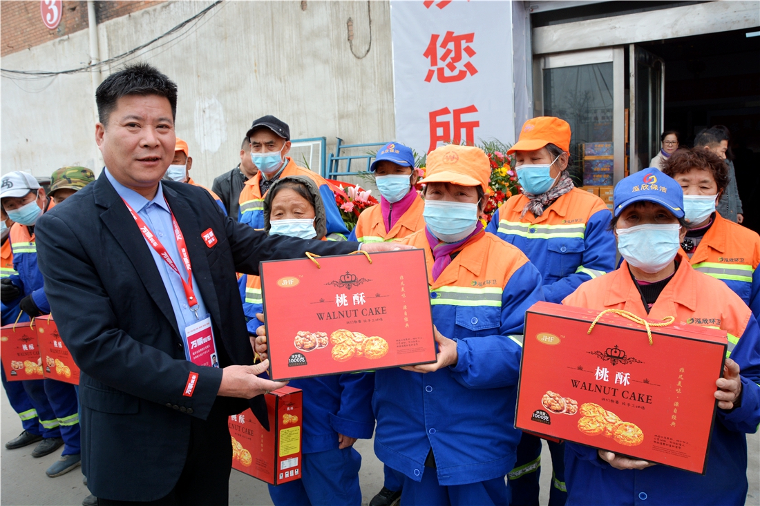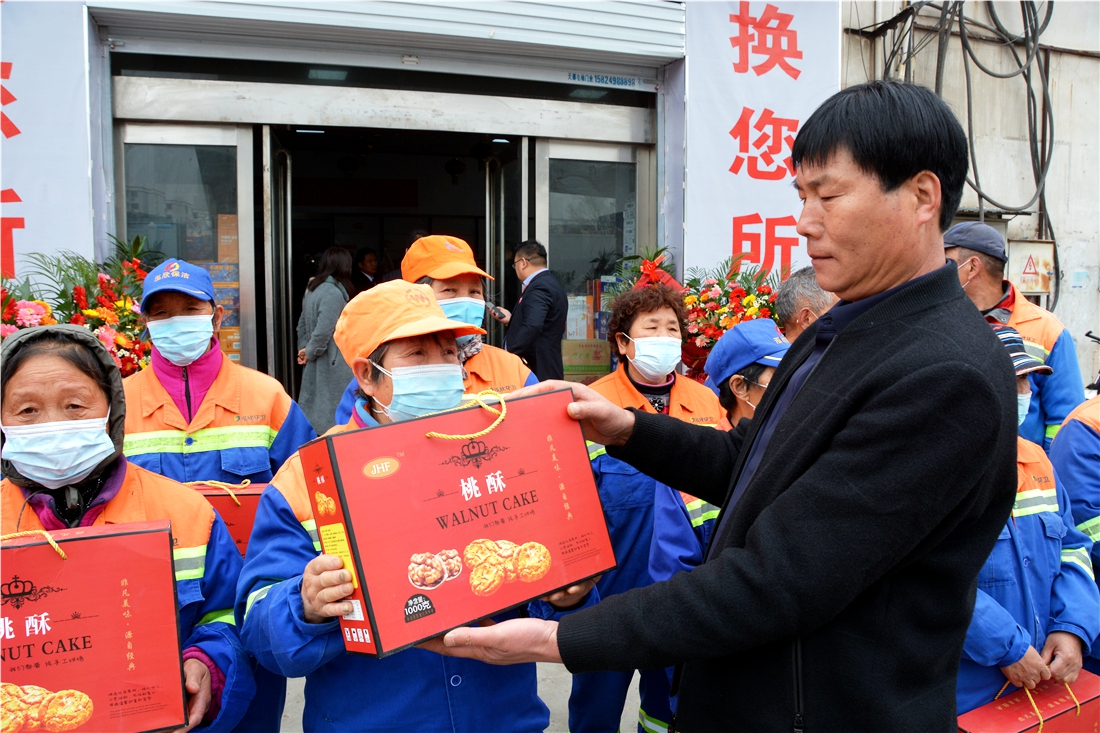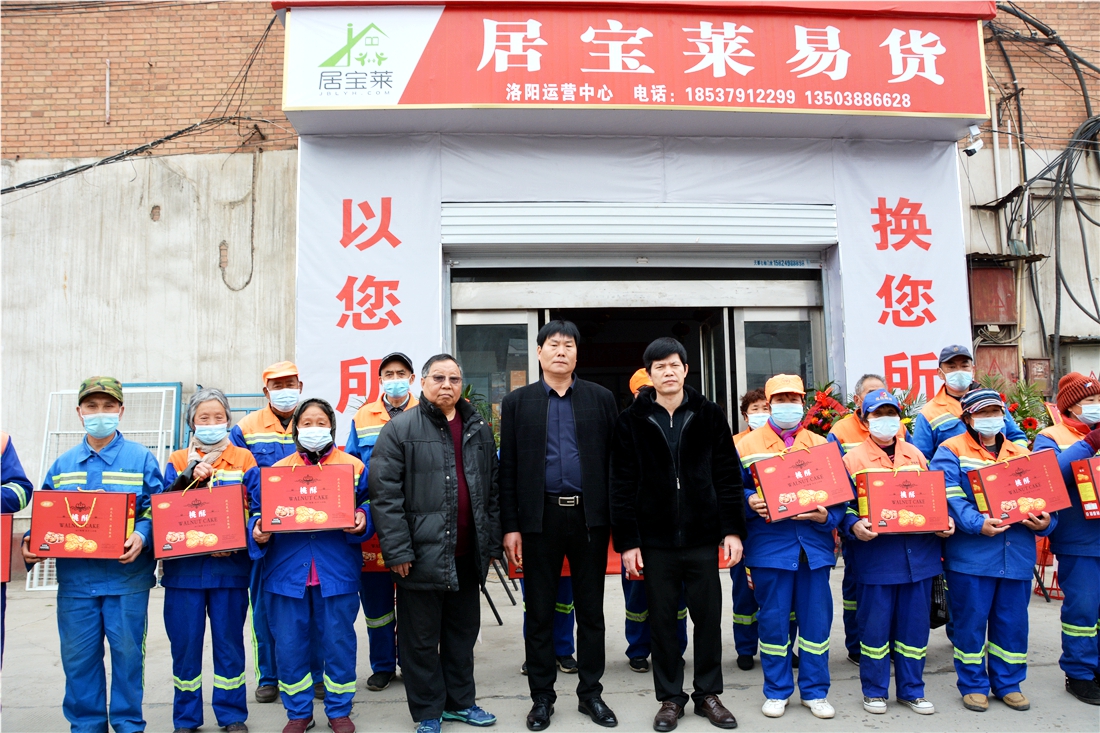 居宝莱易货洛阳运营中心盛大开业现场金储商汇企划袁如鑫、江苏商会副会长张玉兰,居宝莱易货洛阳运营中心董事长董四清等为城市美容师,环卫工人送温暖、献爱心。