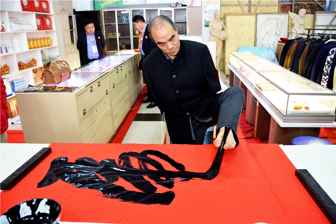 金储商会红色文创第一人、金储红色企业教育领航人、中华第一脚书法家赵杰在居宝莱易货洛阳运营中心现场书写作品祝贺盛大开业。
