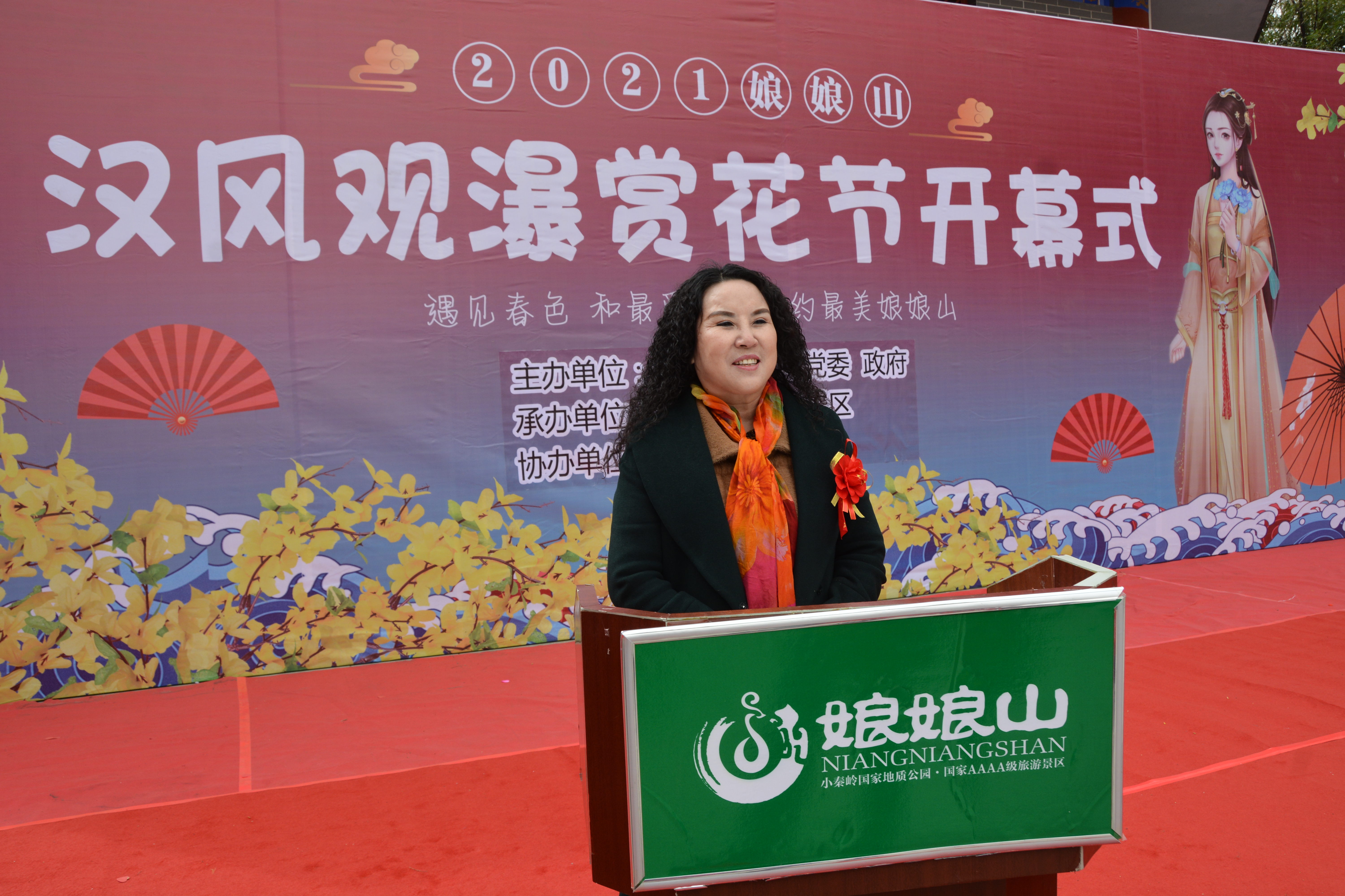 焦村镇主任科员赵继红讲话:尊敬的各位领导、各位来宾、同志们、朋友们:大家上午好!娘娘山色秀,衡岭万木春。今天,我们相聚在这里,共同参加2021年娘娘山第二届“汉风观瀑赏花节”启动仪式。在此,我代表焦村镇党委、政府向娘娘山景区表示衷心的祝贺!向出席活动仪式的各位领导、各位嘉宾和社会各界朋友表示热烈的欢迎和衷心的感谢! 近年来,我们焦村镇以娘娘山景区开发为龙头,依托独特的自然资源和区位优势,突出产业发展引领特色项目,带动整合民俗文化、观光采摘、休闲垂钓、农家餐饮等旅游资源,带动全镇自然山水游、民俗文化游、农耕体验研学游等乡村休闲游蓬勃发展,推动文化与旅游相互融合,大力实施旅游兴镇战略,娘娘山景区,是国家4A级旅游景区、小秦岭国家地质公园的主园区。自然风光秀美,山水相映成趣,四季景色各有韵味,一山包罗万象。景区内千山壁立、沟壑纵横、奇石罗列、幽谷清泉。无论是远足踏青赏春花,还是玩转秋千荡春风;无论是高空远眺石瀑布,还是绿色山珍尝鲜游;无论是汉风民俗赏春韵,还是地质研学拓展训练,都让人心驰神往。各位领导、各位嘉宾,春风拂面,草长莺飞,山花烂漫,此刻的娘娘山正当时。万亩野生连翘迎春怒放,漫山尽披黄金甲的景象蔚为壮观;百尺石瀑熠熠生辉,登高远眺,令人心旷神怡;“越罗衫袂迎春风,玉刻麒麟腰带红”的汉服之约,让人向往。在此,我衷心地祝愿此次活动中,大家能真正地放飞心情,融入自然,尽情体验汉风观瀑赏花的乐趣。最后预祝2021年娘娘山第二届“汉风观瀑赏花节”顺利开展,谢谢大家!