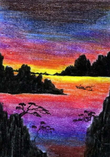 画名:《霞光》 作者: 冯新磊 年龄: 14岁 整体画面设计较好,色彩运用大胆,巧妙运用效果,彰显出黄昏日落的景色,天空炫彩的效果与大地一片沉寂黑暗形成强烈对比。
