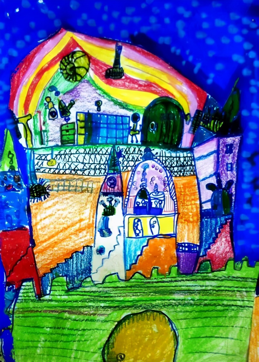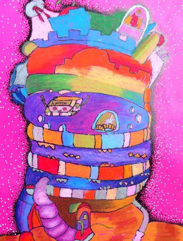 画名:《未来房子》 作者: 郭语翔 年龄: 7岁 这幅作品让我们发现了一个美妙的世界,在小女孩的内心深处用色彩搭建自己心中的房子。也许是童话的美好带给儿童的启示。