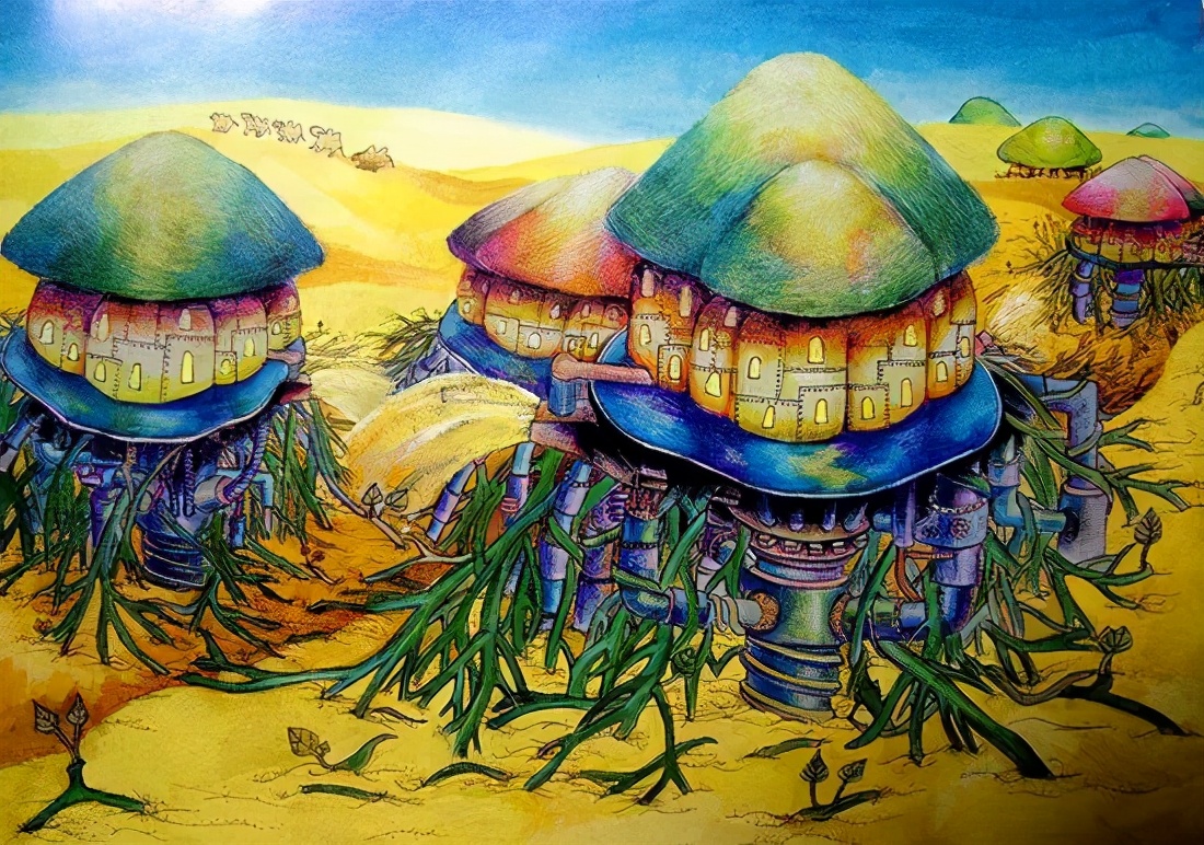画名:《蘑菇房》 作者: 许洪川 年龄: 13岁 画面技法运用熟练,造型独特,色彩运用具佳,具有很好的科幻效果。