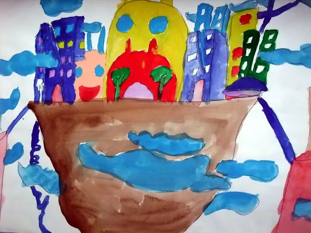 画名:《空中之城》 作者: 李颜言 年龄: 8岁 作品想象力大胆,造型自然生动,用笔不拘小节,自由奔放。颜色处理也比较大胆,亮丽。