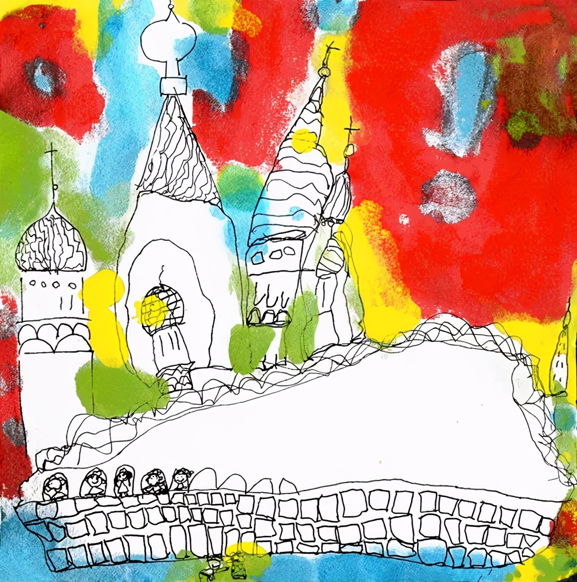 画名:《公主的城堡》 作者: 王蔚晴 年龄: 6岁 生动的线描绘出了城堡的层次,红黄蓝的运用衬托了背景突出了主题,综合手法的运用恰到好处。