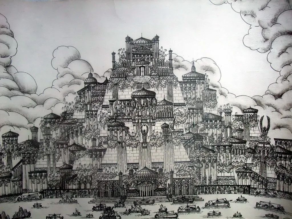 画名:《空中花园》 作者: 肖仲尧 年龄: 14岁 作品是一幅写实性的图画,从中可以看出,作者素描的基本功扎实,造型能力强,对复杂的场景描摹得非常细致。