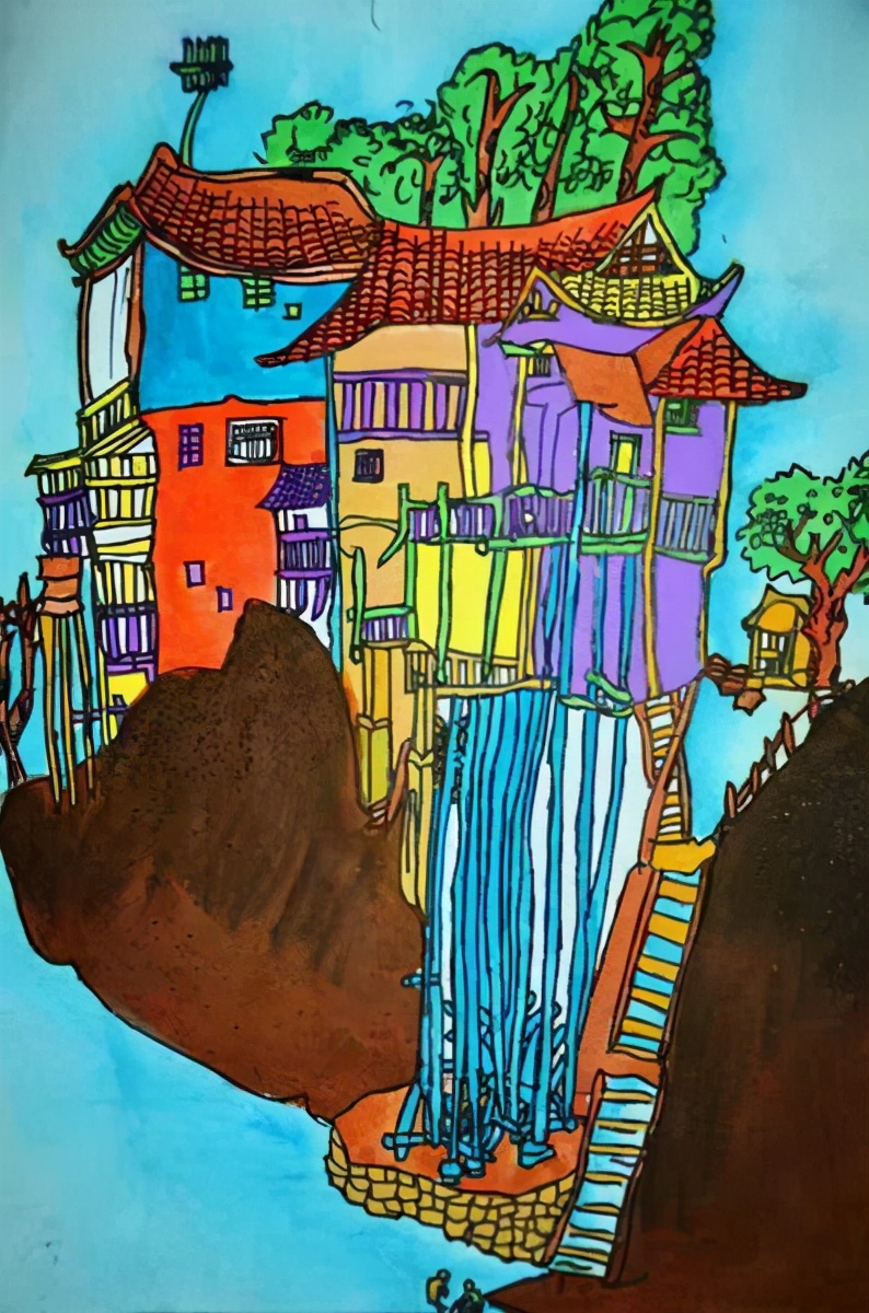 画名:《吊脚彩楼》 作者: 彭佳慧 年龄: 12岁 创作性强,角度新颖独特,色彩运用明快,整体效果极佳,是装饰画不错的选择。 创造力是小朋友作品中最宝贵的存在,大家如果喜欢儿童画,可以关注公众号“少儿画苑书画大赛”,分享各种题材的优秀儿童画,总能从中找到一些感触。 本文图片均来自中国少儿艺教网