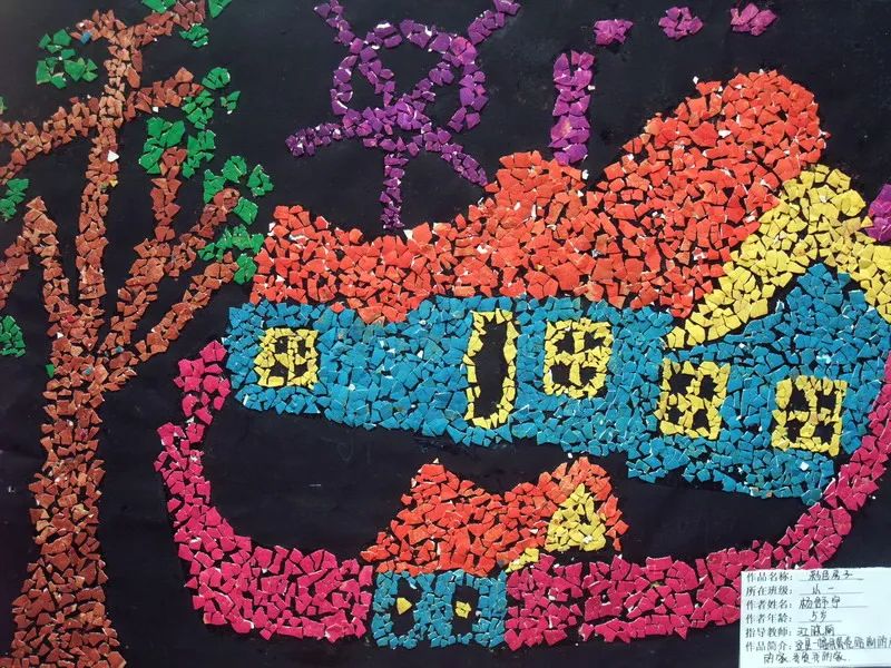 画名:《彩色房子》 作者: 杨舒宇 年龄: 5岁 五岁的小朋友粘贴得如此精细,在粘贴之前还做了很多工作比如染色,很漂亮的装饰画。