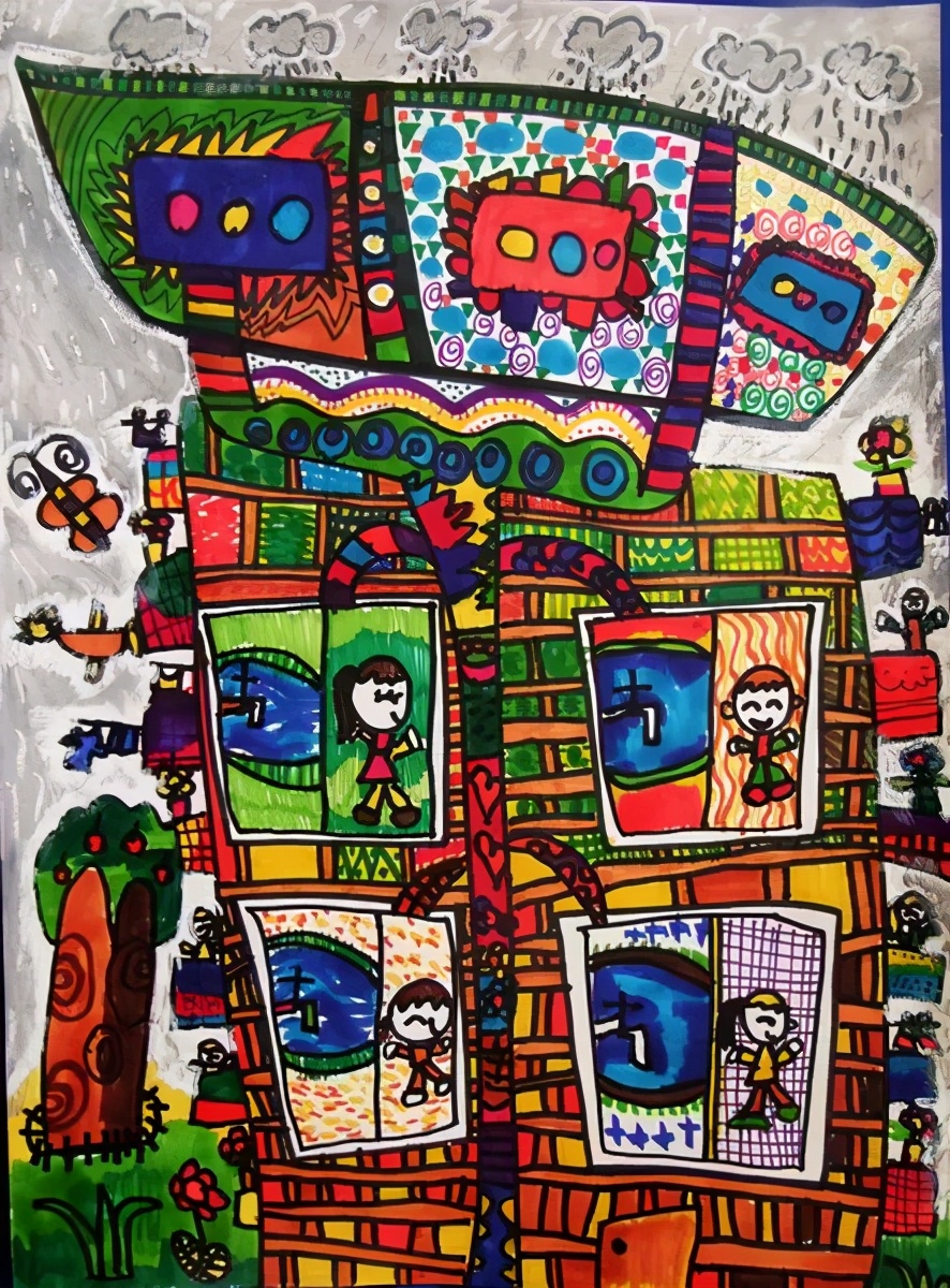 小朋友就应该有个天马行空的童年,看待任何事物都有超越认知的见解。房子是每个人待的时间最长的地方,所以也成为小艺术家们的创作题材。本文的儿童画都是他们异想天开地呈现,房子不应该是方方正正的笼统印象,也应该充满童真趣味。