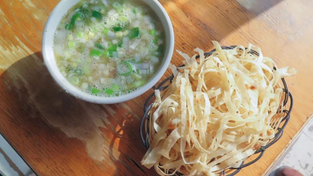 浆面条一定要搭配炸馍片,一个香脆,一个软烂,二者相辅,这顿饭就吃得更加有滋味了。