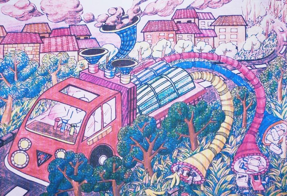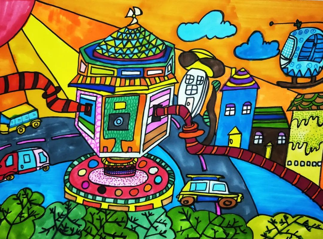 这是一幅科幻画,小作者的想法很好,画面色彩运用丰富,技法熟练,表达了作者对美好生活的向往。