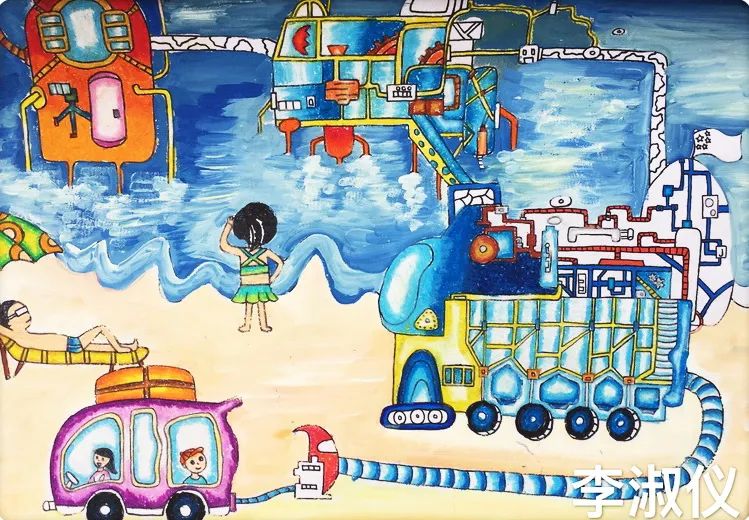 这是一幅科幻画,海水转换能源器,即合理利用了海洋资源又环保健康,创意真是太好了,表明了作者对美好生活的向往及积极向上的态度。
