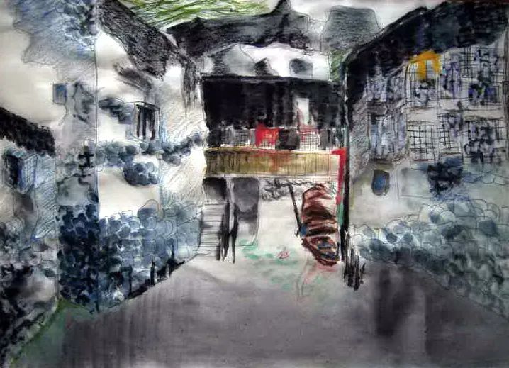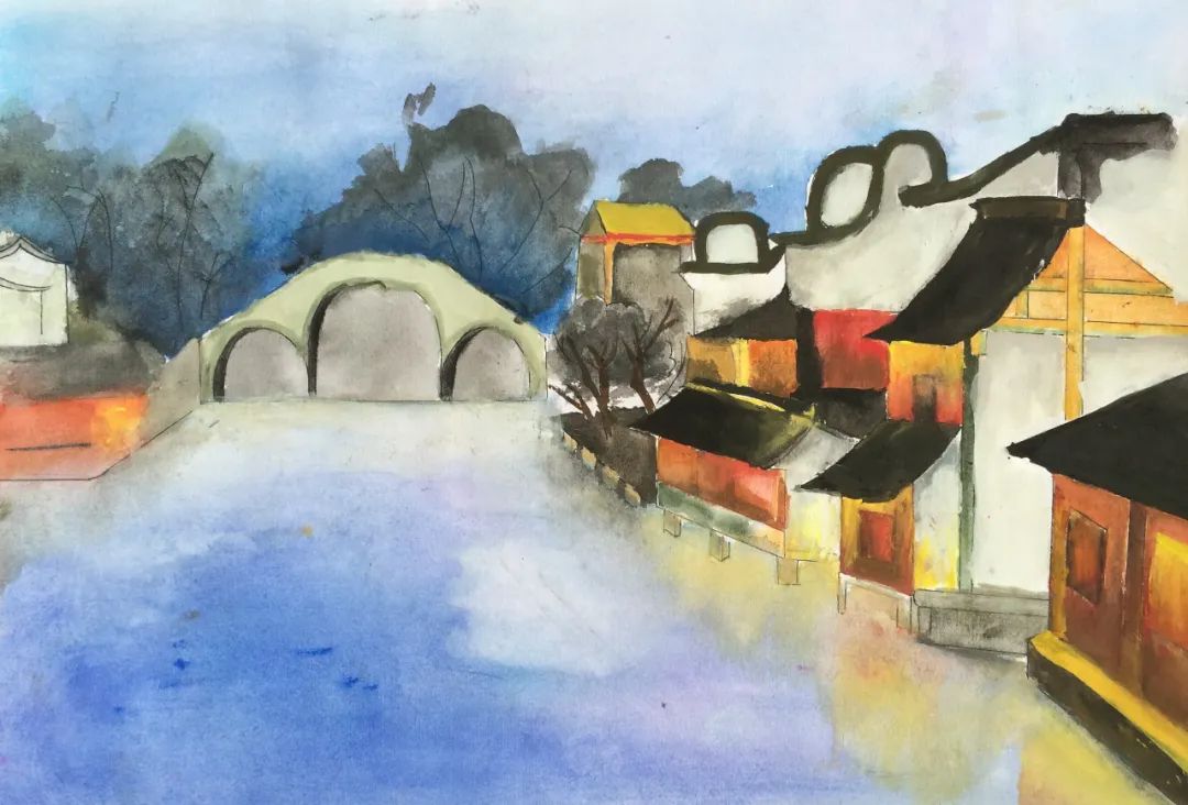 江南水乡,是具有诗情画意的存在,它有诗歌中小桥流水有人家的悠远,有烟雨朦胧的梦幻美景。静谧的风拂过,水面荡漾着波纹。 欣赏小朋友的作品,发现江南的房子基本是双层的小楼,河道两岸坐落着些许房子,青白两色交相辉映,水中映照着房屋的影子,一瞬间是那样温柔,有岁月静好之感。