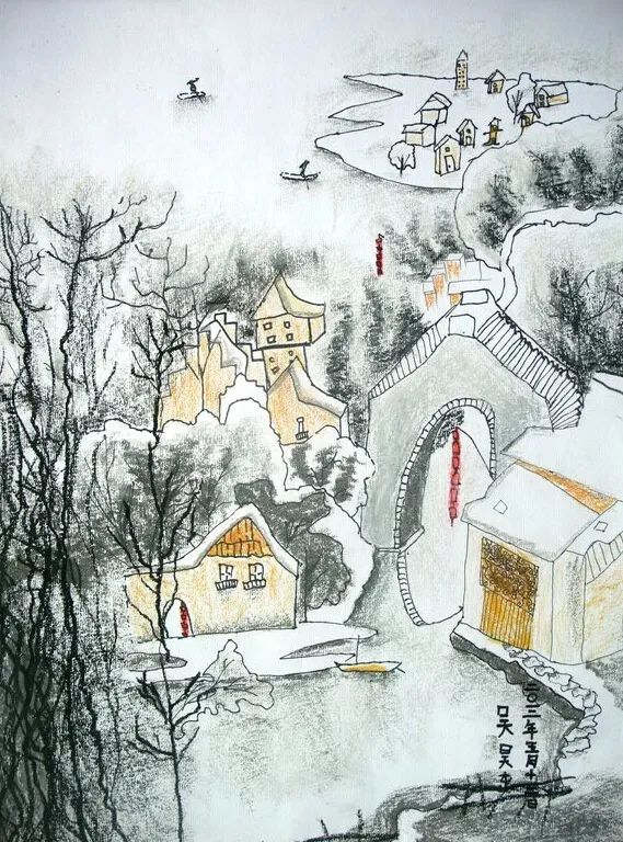 画名:《水乡印象》 作者:郭婉莹 年龄:11岁 作者呈现了一幅如此悠闲和谐的水乡画面,自由的笔触让人真的觉得很浪漫。