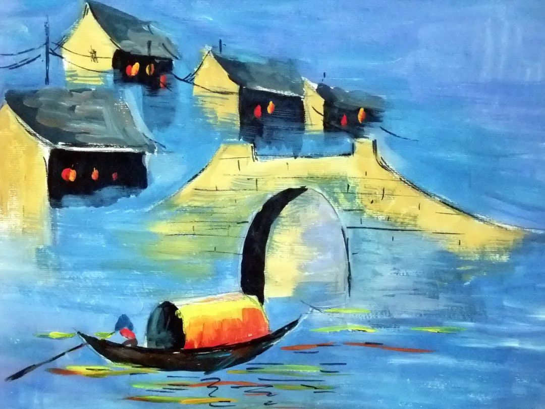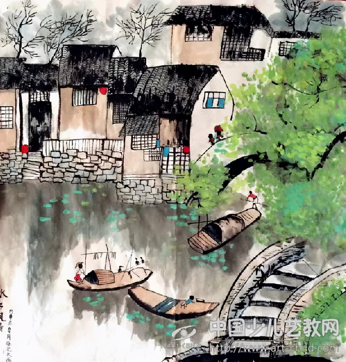 画名:《水乡风情》 作者:张竞文 年龄:10岁 通过对民族风情的了解,把温柔水乡的高雅,清新描写的淋漓尽致,意境感十足。