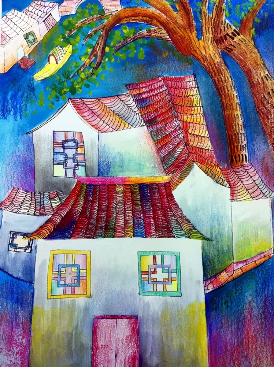 画名:《水乡》 作者:李梓毓 年龄:11岁 说到水乡就会想到水很多,作者以这一特点,写意性的构思了这一场景,红黄蓝的运用相当好,是不错的一幅佳作。