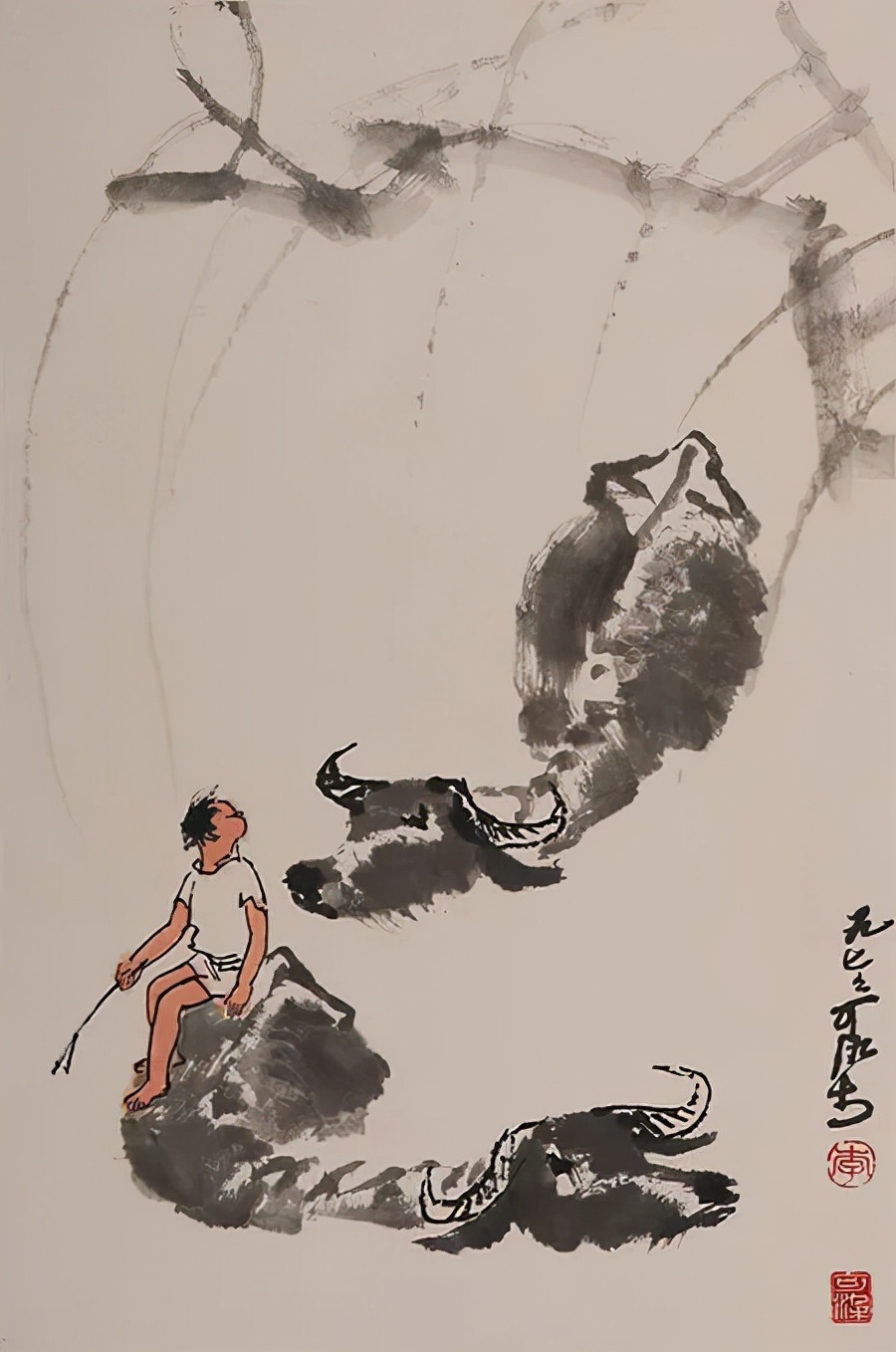 李可染(1907-1989)。中国近代画家、诗人,也是齐白石的弟子。自小喜爱绘画,山水、人物皆擅长,画牛更佳。李可染画的牛极富生活情趣,或行、或卧、或凫于水中;牛背上,稚气的牧童悠然自得,或观山,或引吭,或竞渡,寥寥数笔,便勾出一幅质朴而生机盎然的田园小景。
