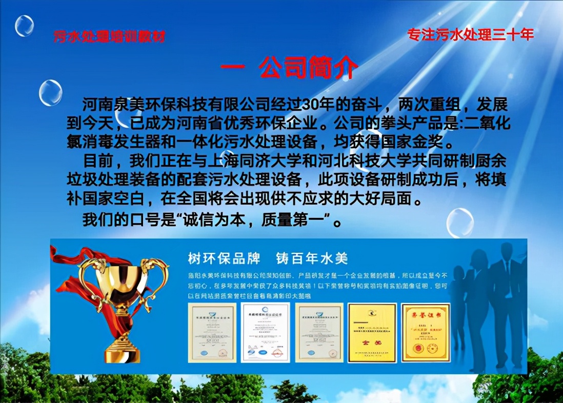河南泉美环保科技有限公司、洛阳水美环保科技有限公司是主要生产生活污水处理设备专业环保公司、是一体化污水处理设备、二氧化氯发生器消毒设备、医疗污水处理设备、工业污水处理设备、地埋式一体式污水处理的集设备自主研发设计,拥有自主创新能力的设备供应和相关技术服务为一体的高新技术企业,公司在自主研发自主创新的环保设备的同时,吸取国外同行业先进技术从而开发推出更具有竞争力的产品。获得科研成果发明奖一项、国家专利一项、科研成果进步奖九项等众多奖项,同时所有的环保项目均得到用户好评,其中CLD系列二氧化氯复合消毒剂发生设备荣获“第十二届中国国际环保展金奖产品”荣誉称号。佳云牌系列产品更是被河南省环保产业协会评为“推荐产品”!