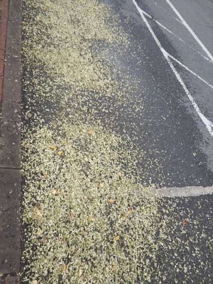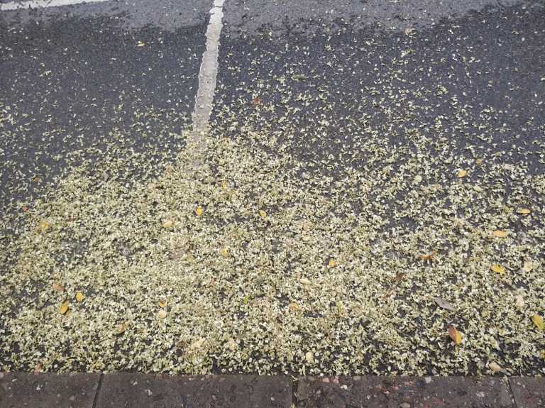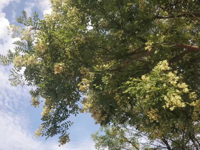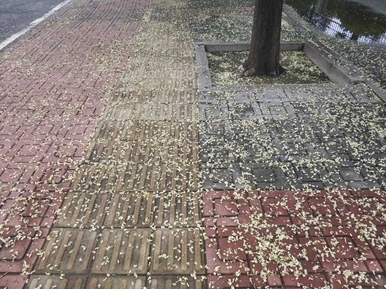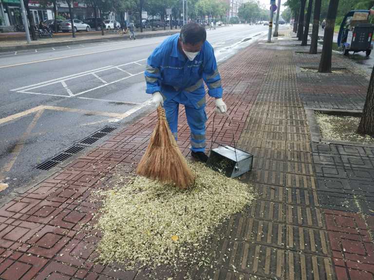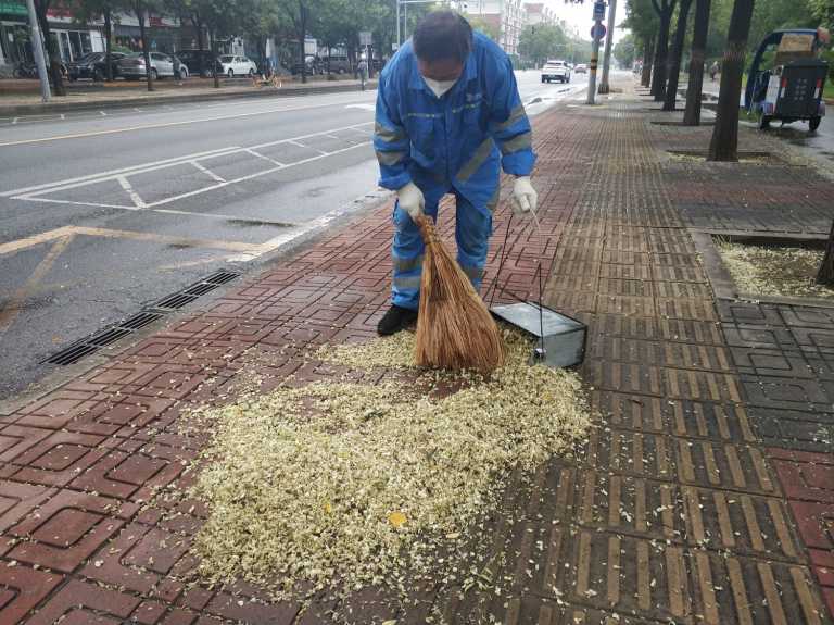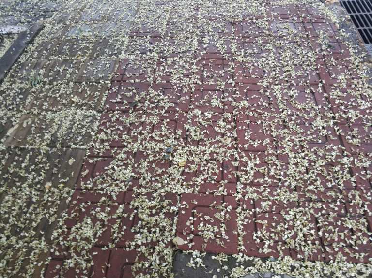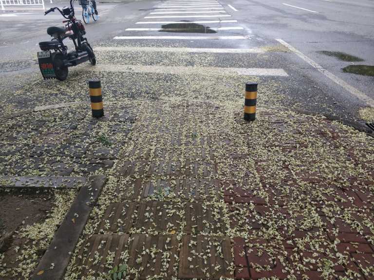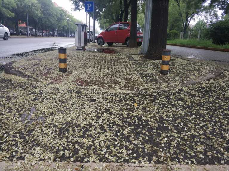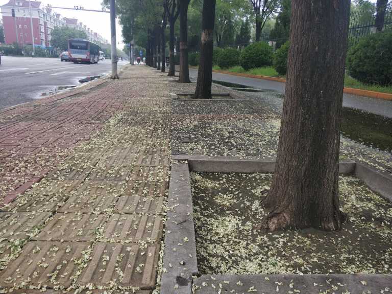 每到七月底八月初,这里的国槐花盛开。晴天风刮满天飞,骑车老迷眼,雨天雨水一打,满地一片白。沾在地面很难清扫,还沾鞋底。一旦长虫,虫屎落地,污染地面……