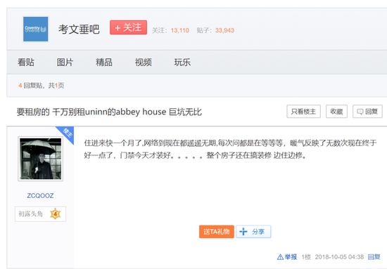 那一年,张量也有新的运作,他成立了黑洞投资,全部以自有资金出资,开辟了房地产以外的第二条投资之路。 张量也是什么火投什么,几年前火热的小蓝单车,就有黑洞资本的4个亿的手笔,只不过后面血本无归。 投资生意刚起步,张量的地产生意也波澜不惊。 2015年,发展了9年实地地产,仅仅只有14.6亿的销售额,还不及人家一个楼盘的销售额。 于是,张量开始发力,斥资31亿,一口气拿下广州黄埔区8宗宅地,准备要大干一场。 那一年,直播风口风起,虽然玩家众多,王思聪仍然成立了熊猫TV,以创业者的身份,下场开干。 此时,王思聪的普思投资,已经小有所成,投资的公司当中,有5家成功IPO,市值最高达到了50亿。 六、 2016年,成家之后的潘瑞,也开始立业了。 他在英国,成立了学生公寓品牌“UNINN”,在考文垂、莱斯特和纽卡斯尔均有全新、高端学生公寓。 这个公寓产品做得好不好,无从考证,但客户跑到贴吧上来吐槽,却是真的。