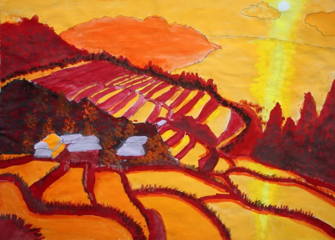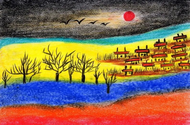 画名:《夕阳下的田野》 作者: 黄蕾萌 年龄: 10岁 作品用色大胆,视野开阔。夕阳西下,一切都铺满金黄与落霞红,给人新奇的感觉。