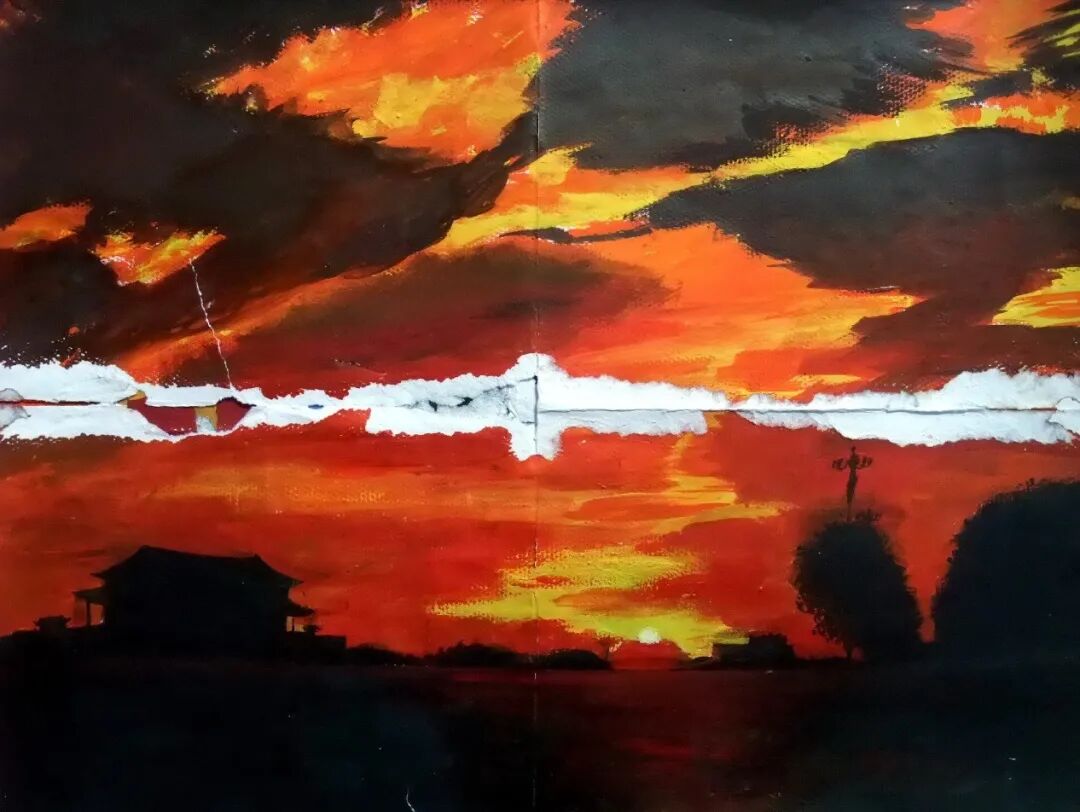 画名:《霞光》 作者: 冯新磊 年龄: 14岁 整体画面设计较好,色彩运用大胆,巧妙运用效果,彰显出黄昏日落的景色,天空炫彩的效果与大地一片沉寂黑暗形成强烈对比。