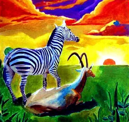 画名:《太阳升起的时候》 作者: 李诗祺 年龄: 12岁 好听的名字就好像摄影作品中有一个如诗如画的题目一样,往往可以起到画龙点睛的作用。斑马和羚羊结伴看太阳升起,给人一种祥和、美好的感觉。
