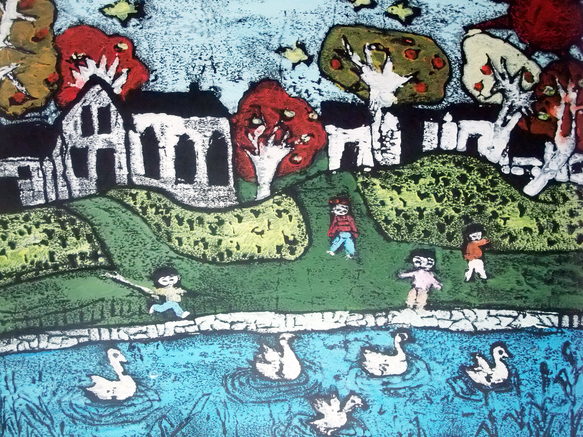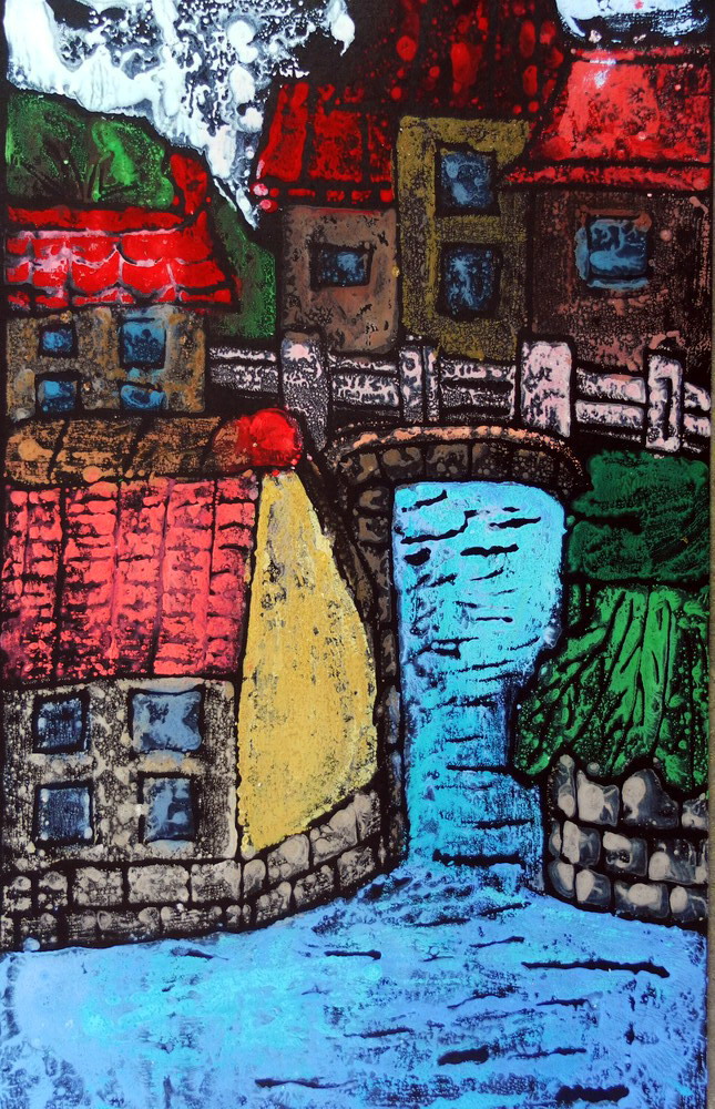 画名:《水乡印象》 作者:李天骄 年龄:8岁 彩版画制作,画面严谨美观,房屋表现自然协调,整个画面有种浮雕效果,具有较高的欣赏性。