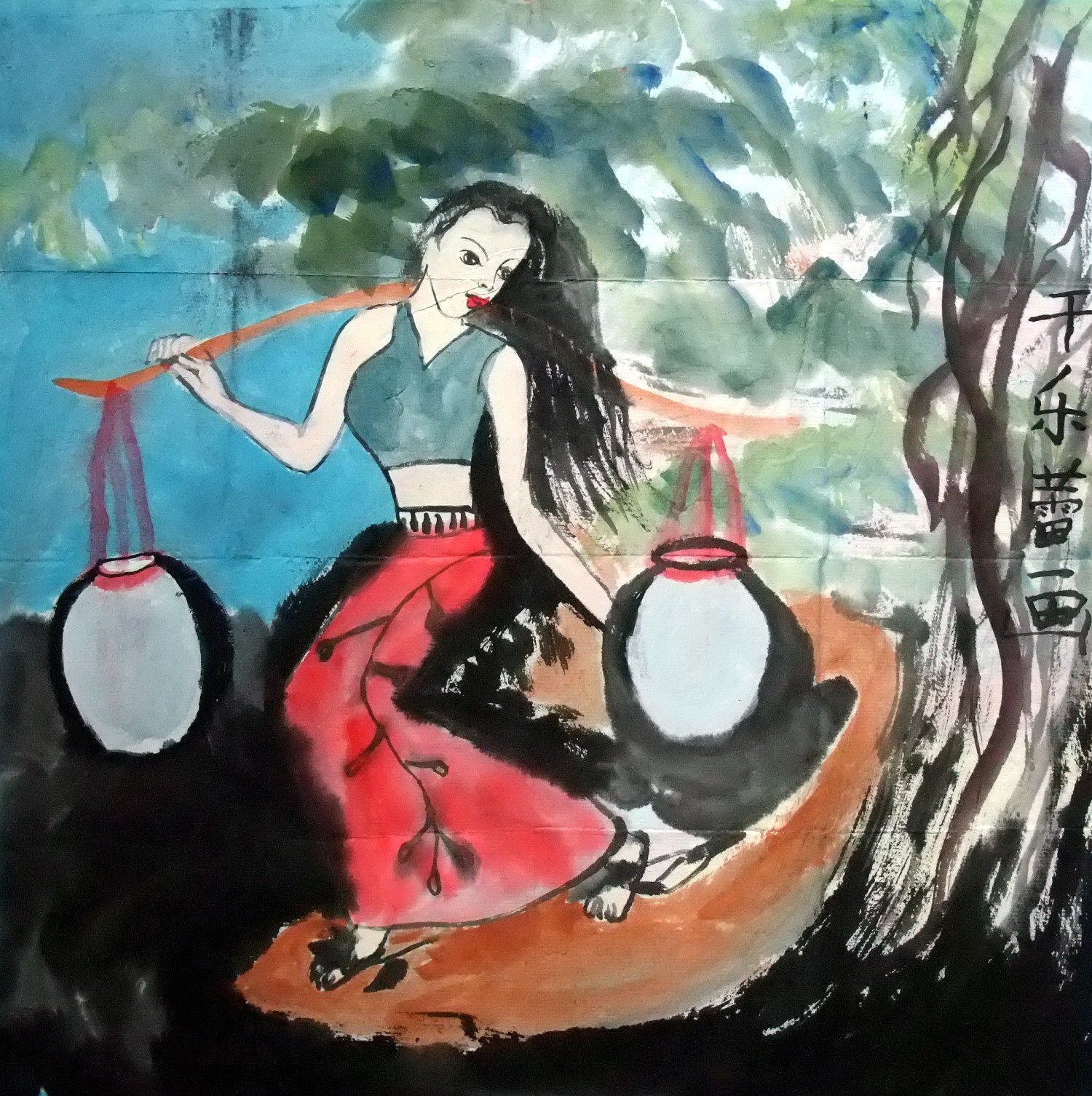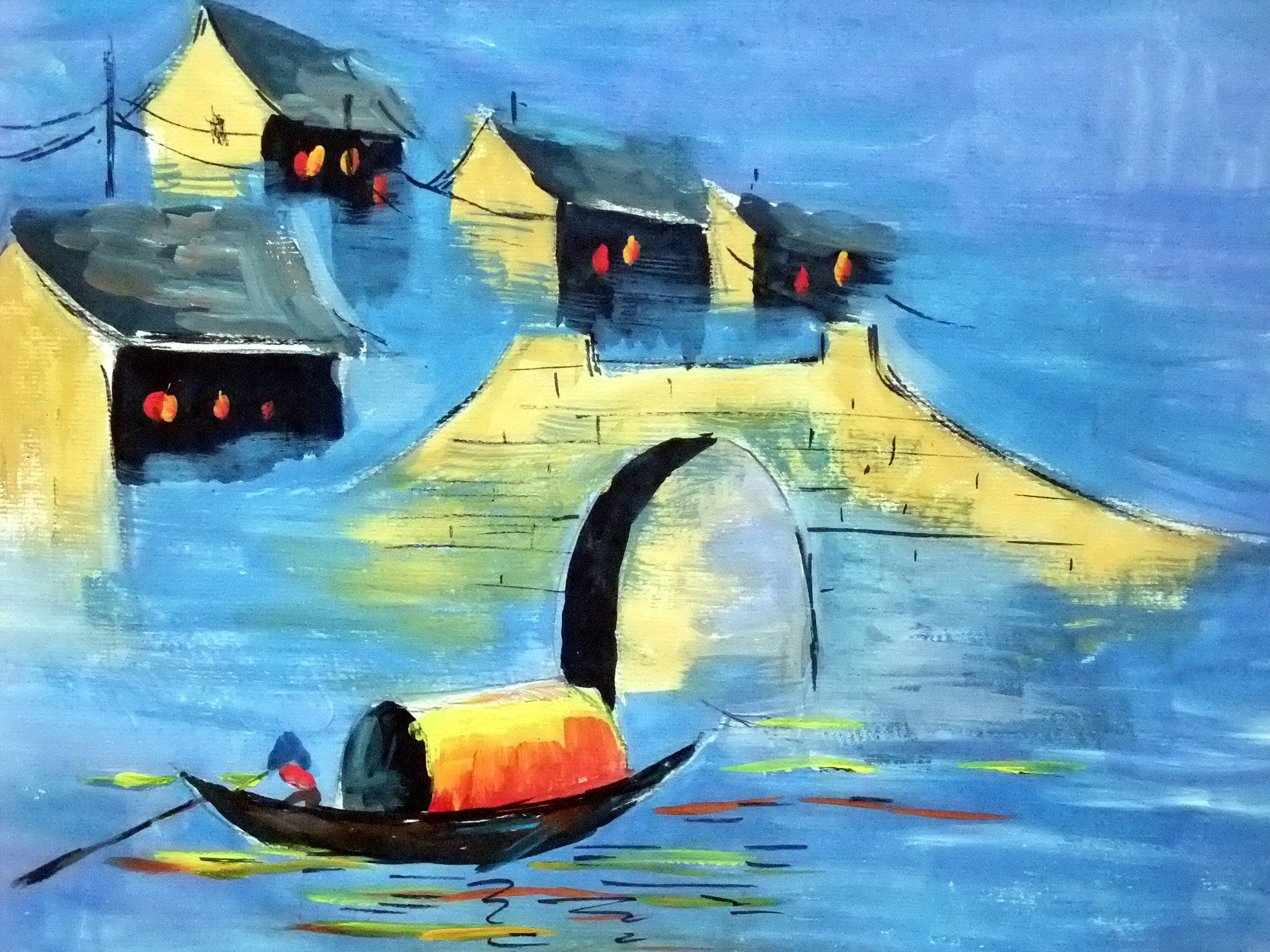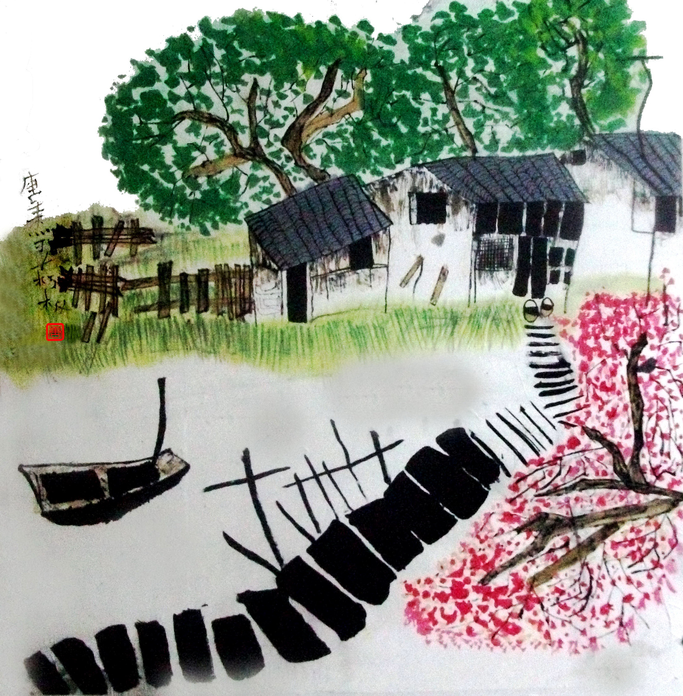 画名:《水乡》 作者:李梓毓 年龄:11岁 说到水乡就会想到水很多,作者以这一特点,写意性的构思了这一场景,红黄蓝的运用相当好,是不错的一幅佳作。