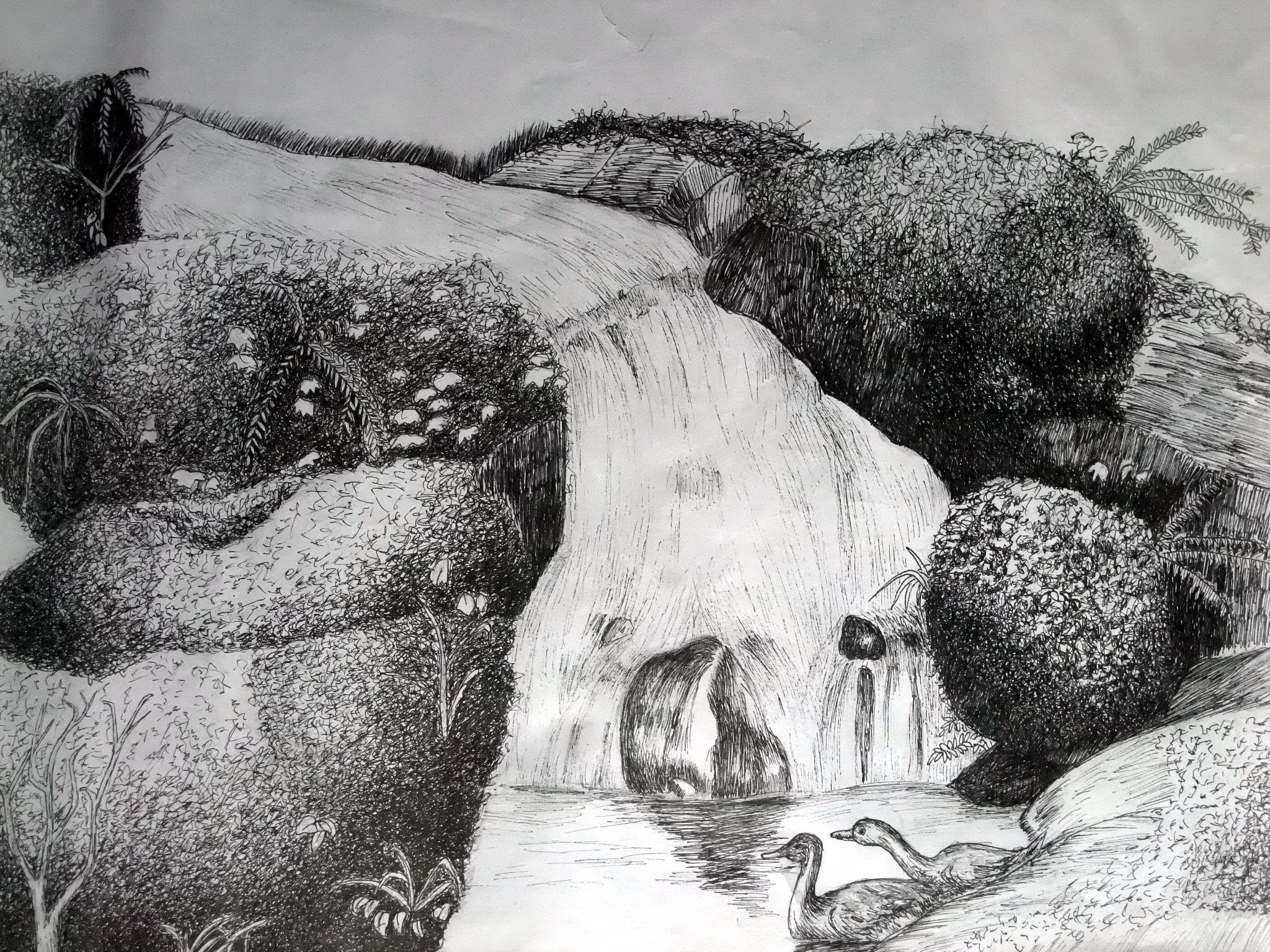 画名:《小溪欢歌》 作者:许杨 年龄:17岁 用素描形式来写实风景是有难度的,作者能把画面表现的这么好,表明了作者绘画功底相当好。