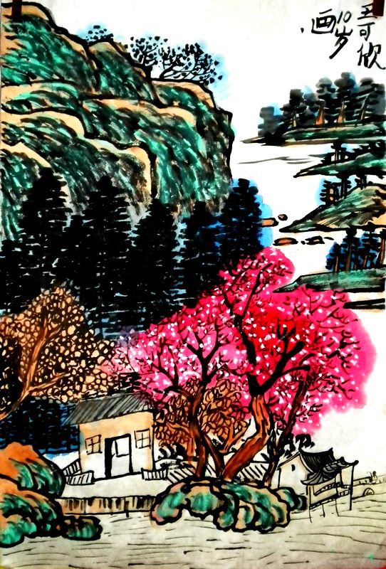 画名:《初春》 作者:郑添元 年龄:11岁 作品通过一树的桃红,很生动形象的将主题表达出来。画面春意盎然,描绘丰富,水墨仙境图画令人心生向往之情。