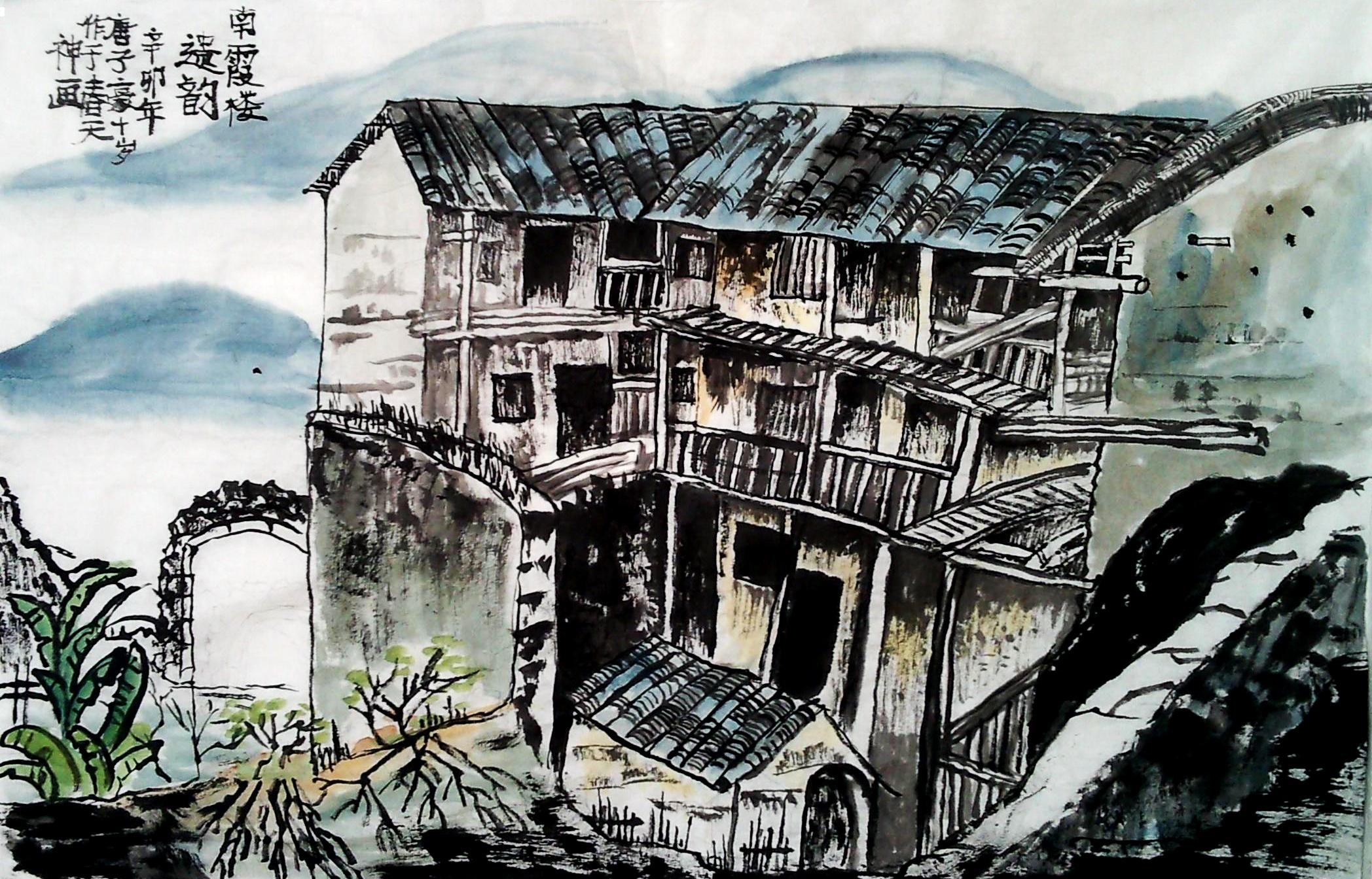 画名:《南霞楼遗韵》 作者:唐子豪 年龄:10岁 作品构图合理,角度比较新颖。大胆的皴擦笔法,很好地表现了房屋古老质朴的气息。