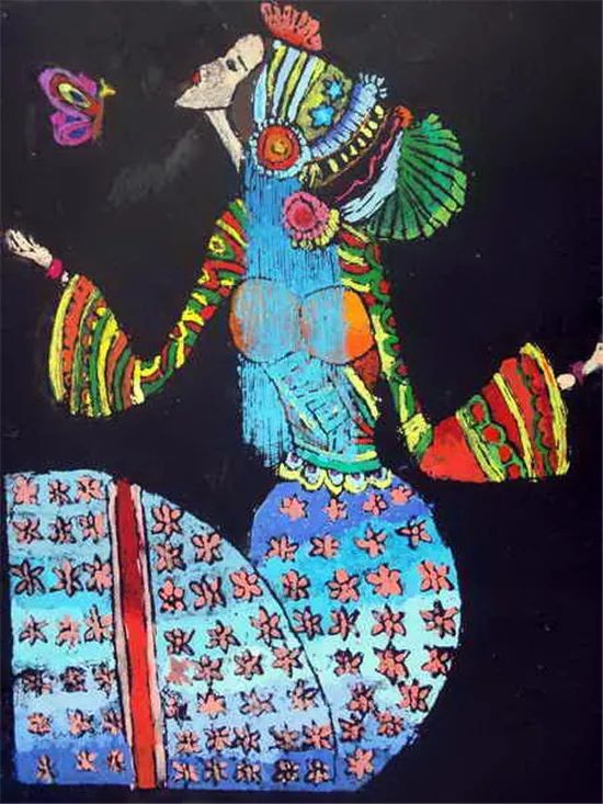 画名:《民族》 作者: 刘潇 年龄: 11岁 赛届:第16届国际少儿书画大赛 小作者研学习了民间艺术家和画家的作品,借鉴他们的表现手法,设计装饰性的人物画,体验创造的乐趣。