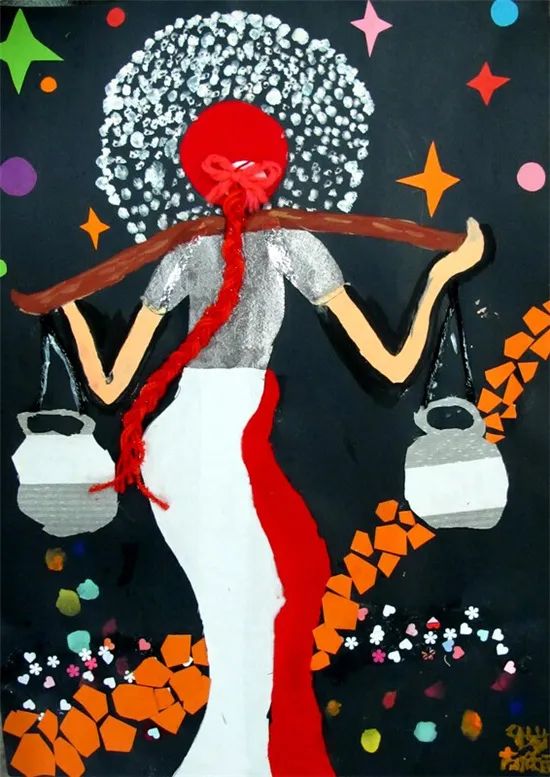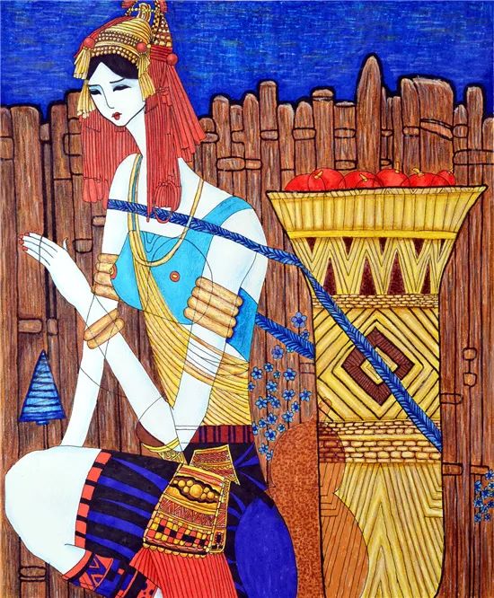画名:《小背篓》 作者: 张佳月 年龄: 15岁 赛届: 第18届国际少儿书画大赛 装饰画人物是展示理想人物和理想世界,追求一种人为美,形式美。作品中小背篓的附加更衬托出人物的各种美。