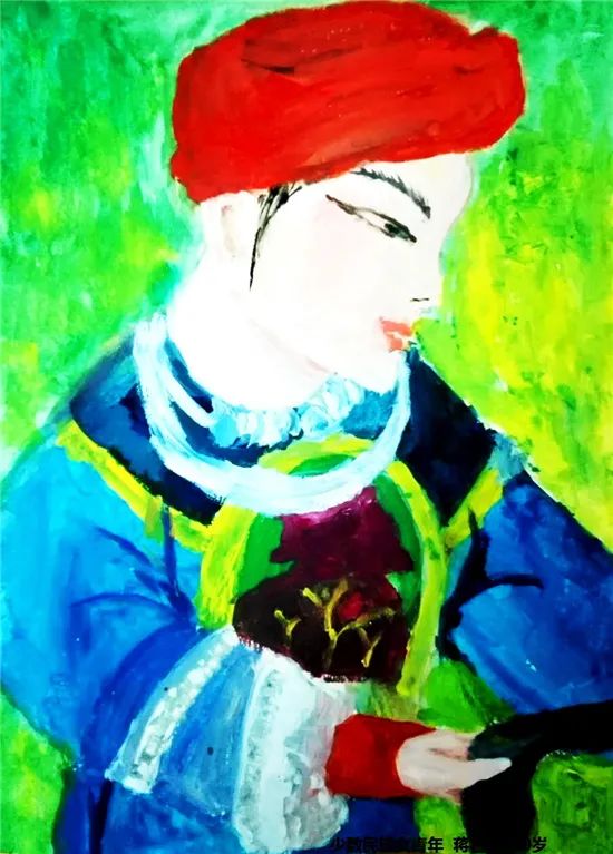 画名:《少数民族女青年 》 作者: 蒋名慧 年龄: 10岁 赛届: 第26届国际少儿书画大赛 这幅画人物造型极具装饰画风格——稚拙而富有创意,用色大胆,构图饱满,很不错。