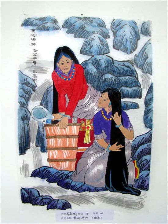 画名:《黄河源头》 作者: 马嘉瑜 年龄: 10岁 赛届: 第16届国际少儿书画大赛 黄河——中华民族的母亲河,华夏五千年文明的发源地。青海省曲麻莱县,黄河源头第一县,母亲河的发源地。作者用在河边梳洗的特有镜头表达对母亲河的热爱。