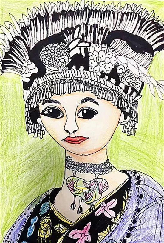 画名:《苗族姑娘 》 作者: 朱彤 年龄: 9岁 赛届: 第26届国际少儿书画大赛 线条疏密有致,点线面的逻辑关系处理得当,画面构图饱满,主题造型生动,真实地展现了民族人物的特征。
