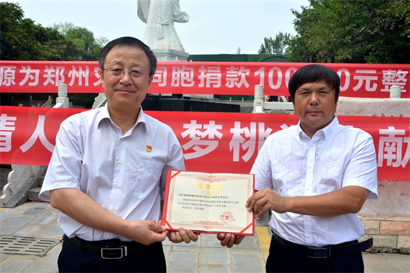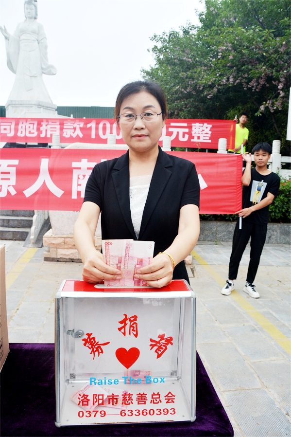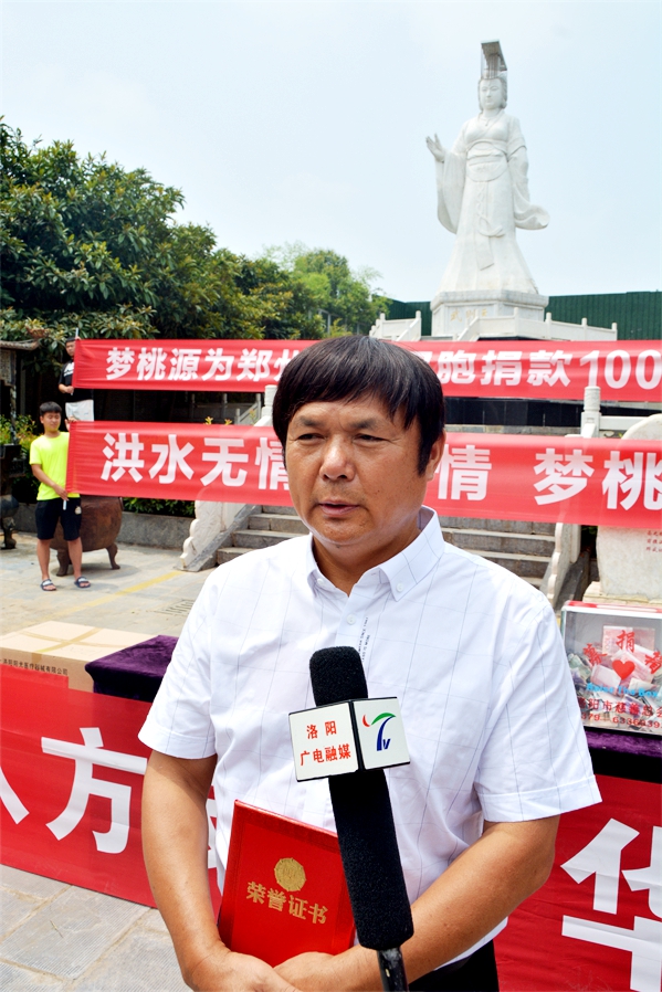 赵松林 宋清 春阳 洛阳梦桃源餐饮服务有限公司董事长李双军向河南受灾地区捐赠10万元现金和10万元物资。