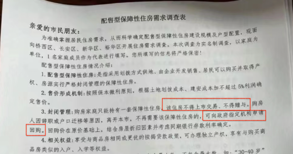 要想了解你有没有资格申购,可以等待各自城市的官方细则。 以现在公布的城市细则来说,如果你有本市户籍,没有自住房或者房子小到不够住,比较有希望“入围”有份申购的人群。 03 说回来,不少收到通知的小伙伴,心里也是忐忑的。 有读者来问过橘姐—— 配售型保障房到底能不能申请?会有坑吗? 我个人认为啊,关键在于你对房子的真实需求,到底是什么。 保障房便宜是便宜,也不会有烂尾可能,但是,真的没有任何一点点的金融属性。 一份来自河南的需求调查表上,明明白白写着:不得上市交易,不得赠与。