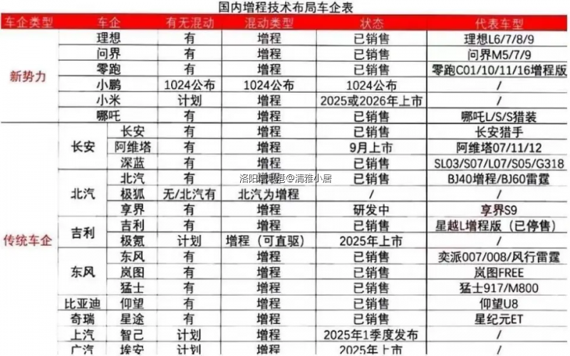 传统厂商与主流新势力大多已经倒向了增程。传统车企中,像长安、北汽、吉利、东风、比亚迪、奇瑞、上汽、广汽等,都有了自己的增程式汽车。新势力中,理想、问界、零跑、哪吒早就推出了增程式汽车。小米规划的第二辆车,也是增程式,也已经在路上了。